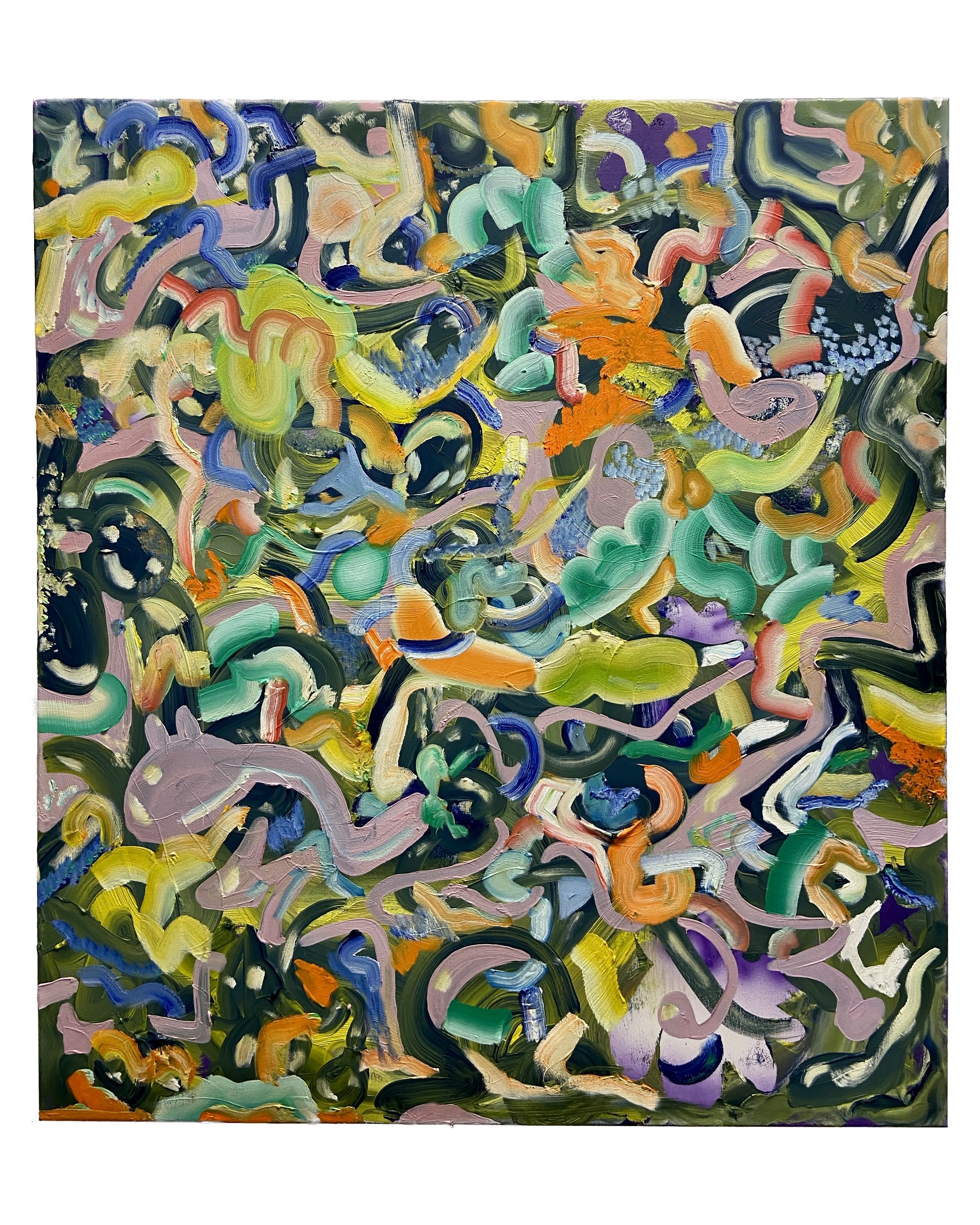 Onuma’s abstract visual language comes from his unique method of painting. At various times throughout the process, he turns the canvas on its side or upside down to continue adding shapes and forms in contrasting orientations. Experimenting with different tints and shades, the artist incorporates multiple layers into each painting to create the final composition. After the initial captivation of the overall painting, the real intrigue of Onuma’s work is what you see as each layer is discovered.